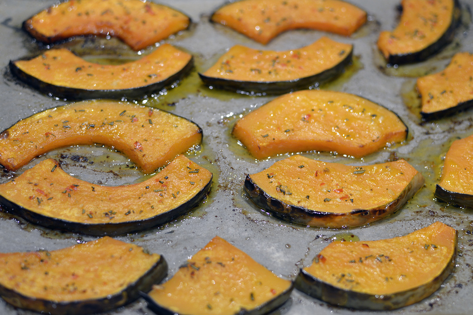 A sütőtököt megmossuk, megtisztítjuk és héjastul felszeleteljük kb. 1 cm vastag szeletekre. A szép, nagyobb szeleteket sütőpapírral bélelt tepsire helyezzük, egy nagyobb gáztepsi lesz tele vele. A leeső darabokat más ételbe használjuk el (krémleves, tunkolós).